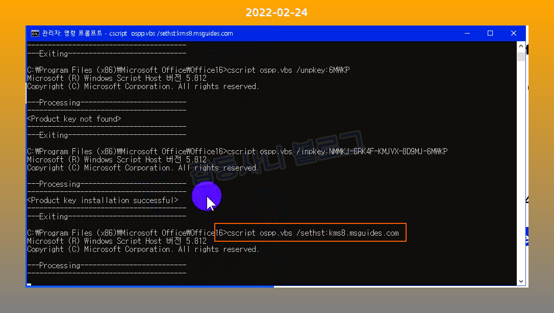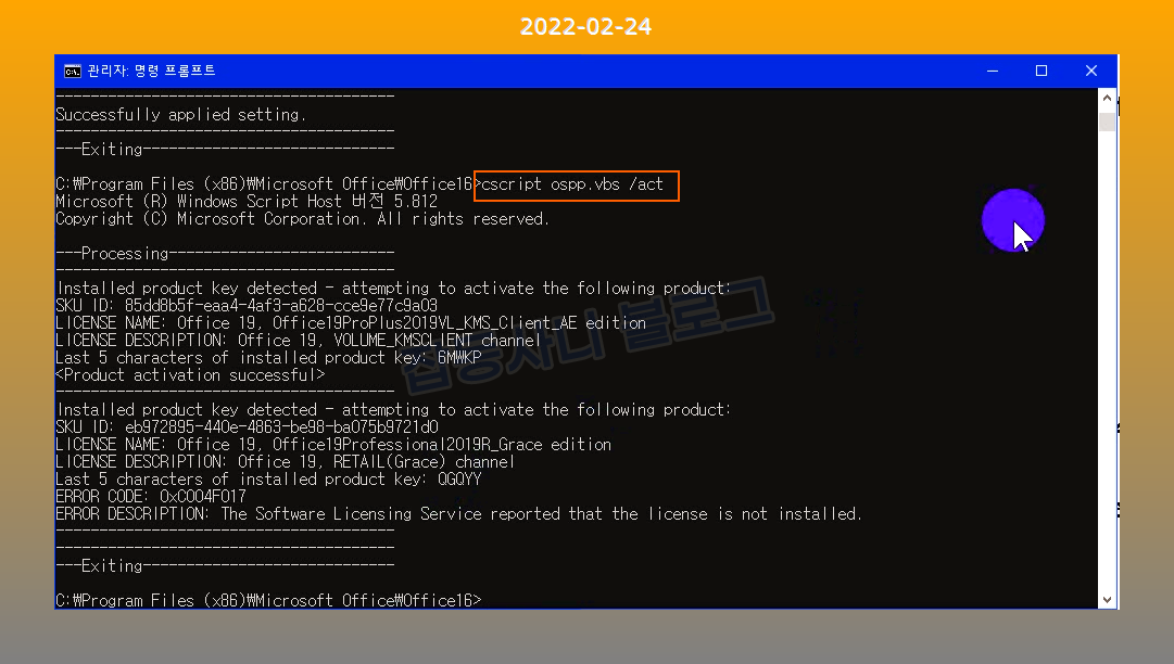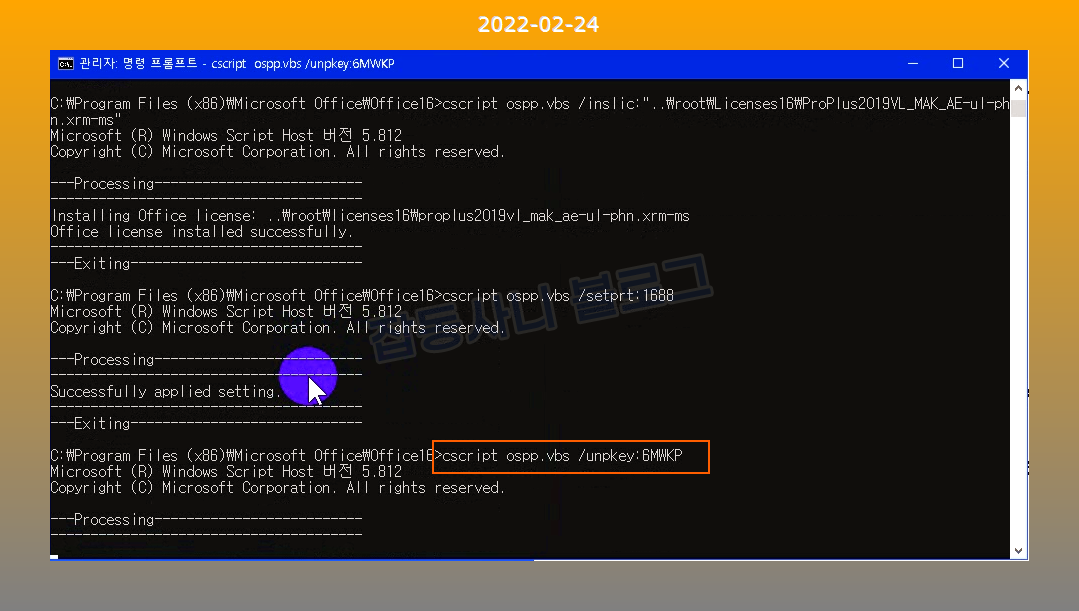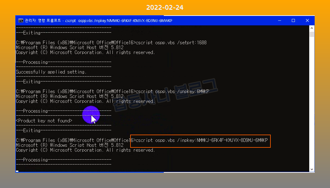 제품키 입력 명령어도 오피스 버전마다 다릅니다.