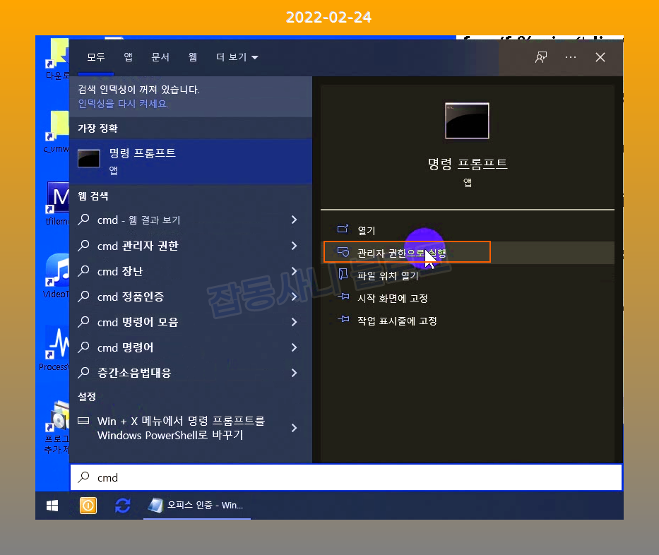 검색에서 cmd 를 입력하면 명령 프롬프트가 나옵니다. 관리자 권한으로 실행을 클릭하세요.