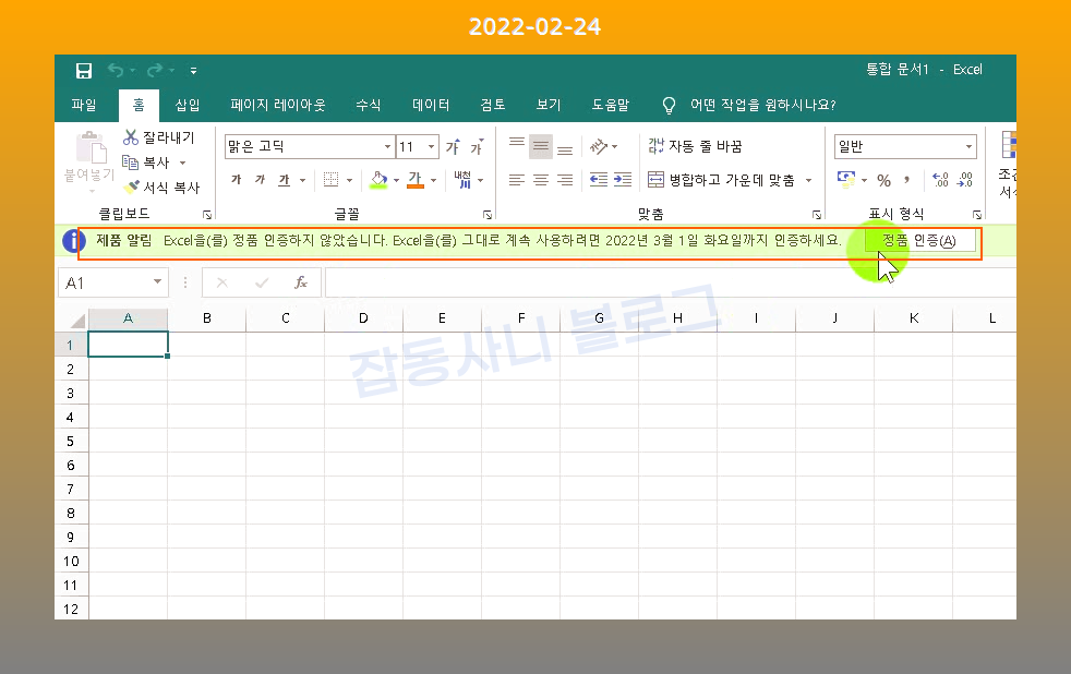 엑셀 문서를 열어보면 상단에 정품 인증 이라는 메세지가 나오네요.