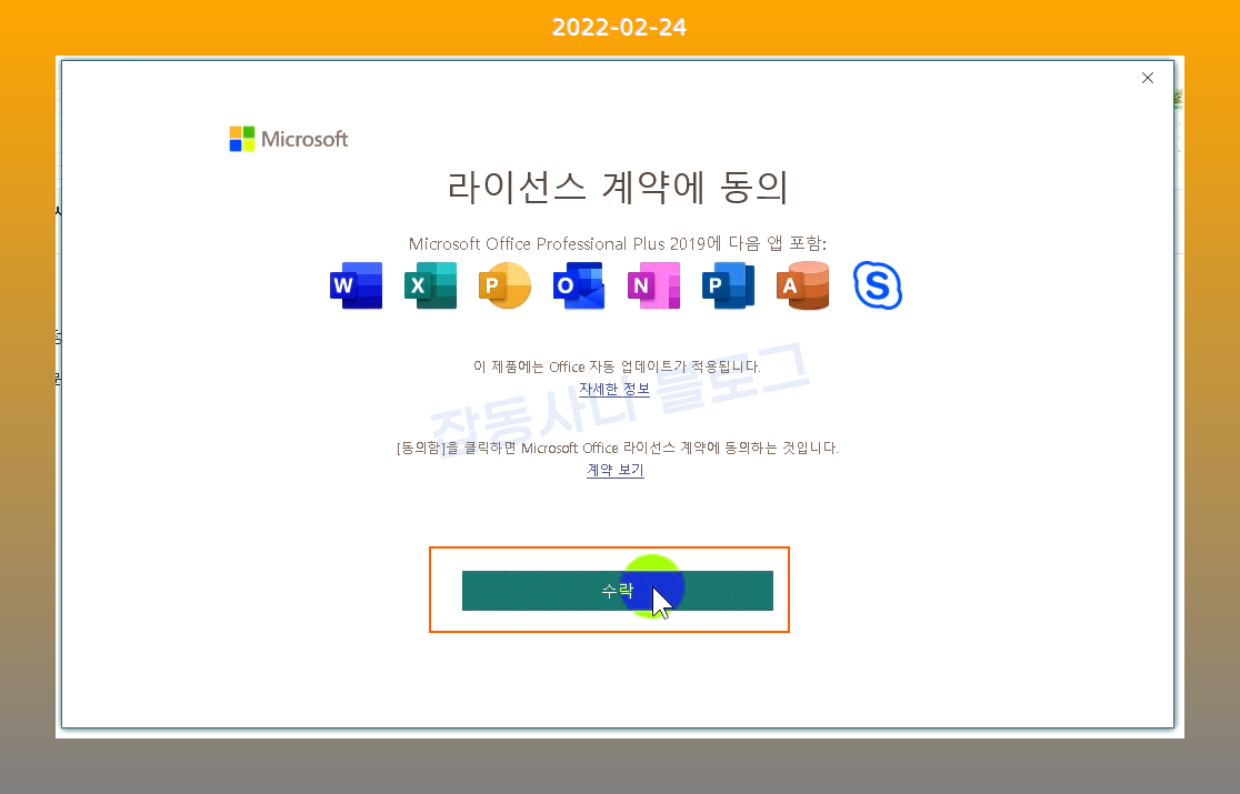 라이선스 계약 동의 화면이 나옵니다. 수락을 클릭하세요.