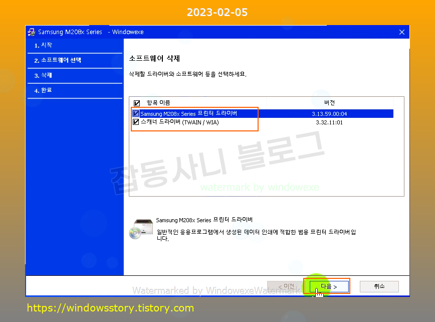 컴퓨터에 설치된 SL-M2085FW 드라이버 프로그램 목록이 보이는데 삭제하고 싶은 항목을 체크하고 다음 클릭.