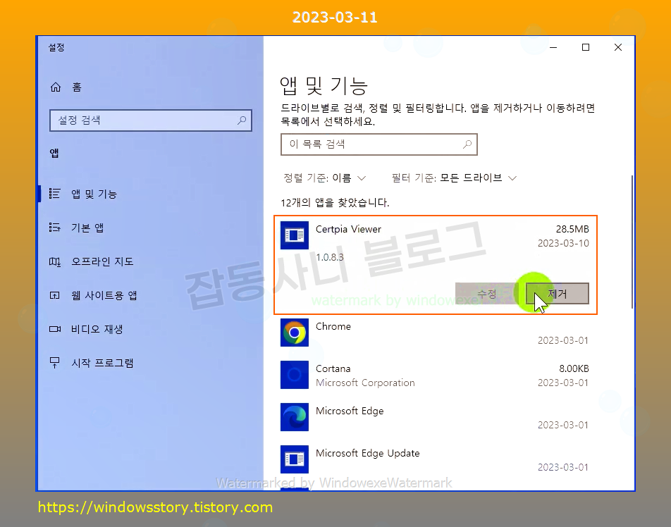 컴퓨터에 설치된 많은 앱이 보일텐데요. Certpia Viewer 를 찾아서 제거를 클릭하세요.