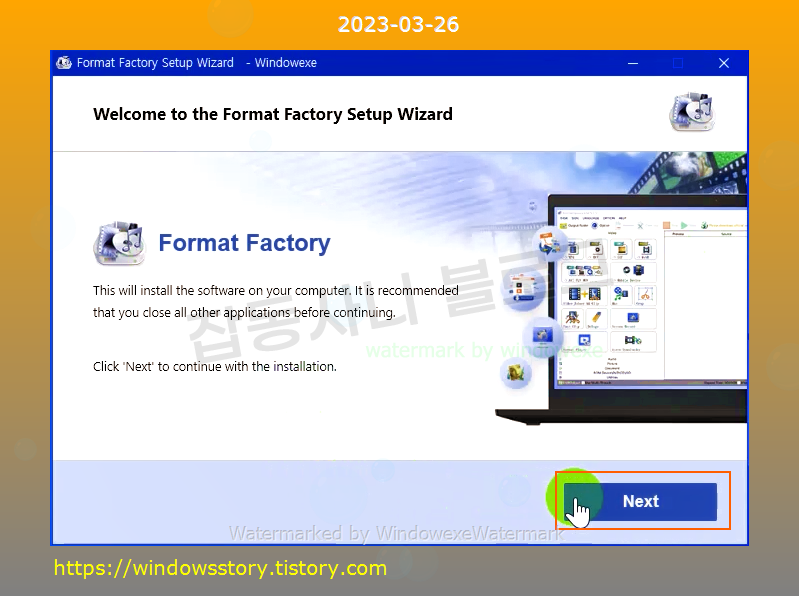 다운로드 받은 파일을 실행하면 프로그램 설치 마법사가 실행됩니다. Next 클릭