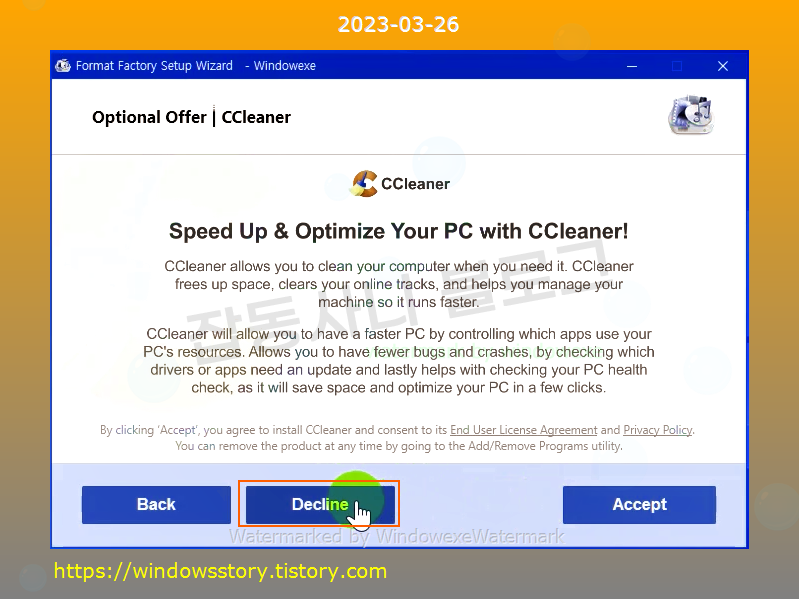 CCleaner 스폰서 프로그램을 설치할건지 물어보는데 Decline 클릭