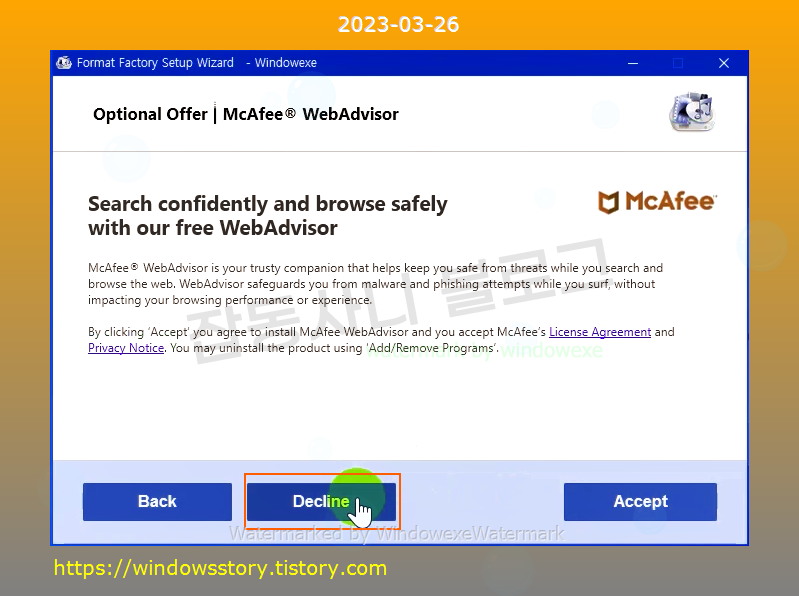 McAfee WebAdvisor 스폰서 프로그램을 설치할건지 물어보는데 Decline 클릭