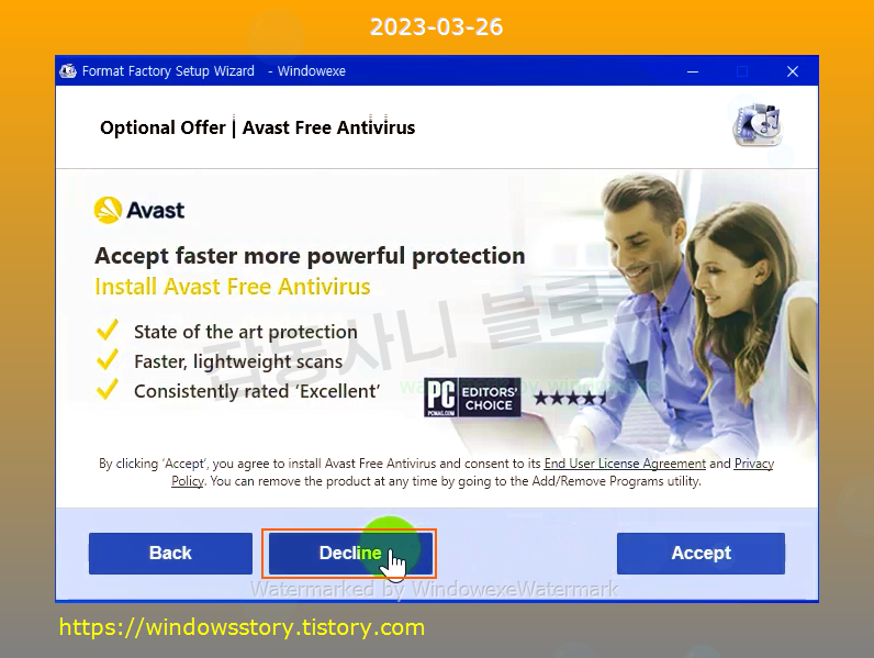 Avast 백신 스폰서 프로그램을 설치할건지 물어보는데 Decline 클릭