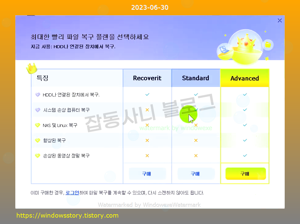 라이선스 : 유료, 무료 사용자는 복구 파일 검색만 가능