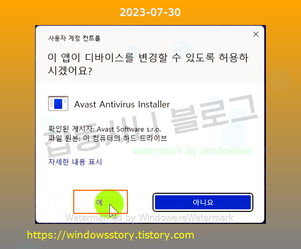 사용자 계정 컨트롤 메세지가 나오면 예 클릭