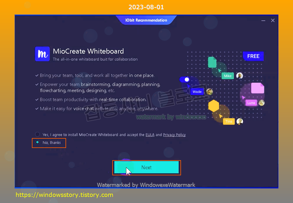 스폰서 프로그램을 추가로 설치할건지 물어보는데 No thanks 체크하고 Next 클릭