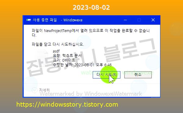 열려있는 파일 삭제 오류 메세지입니다.