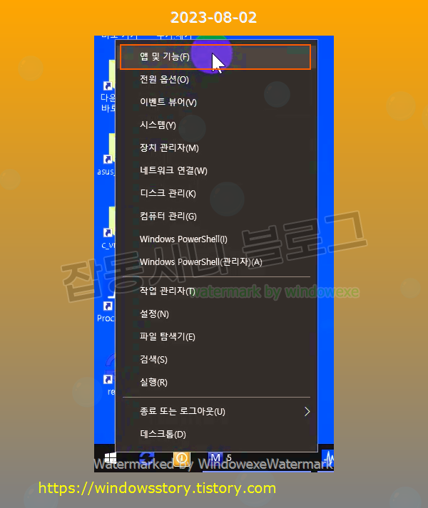 윈도우 시작 메뉴에서 마우스 우클릭하고 앱 및 기능 실행. (윈도우 11에서는 설치된 앱)