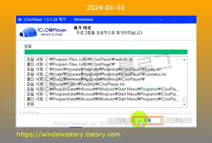 프로그램 삭제가 완료되었습니다. 닫음 클릭