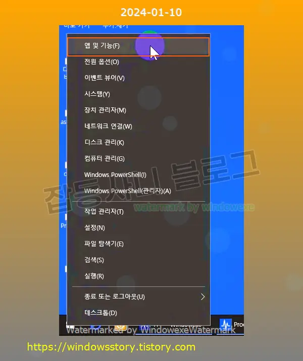 윈도우 시작 메뉴에서 마우스 우클릭하고 앱 및 기능 실행. (윈도우 11에서는 설치된 앱)